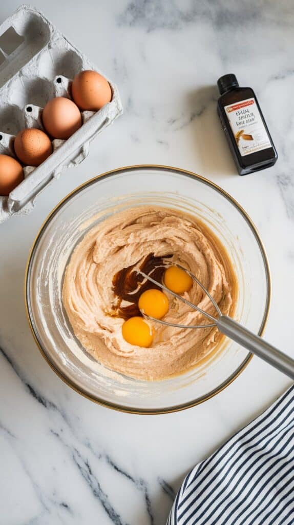 Instructions: Beat in the eggs, one at a time, then add the vanilla extract and milk. Mix until smooth.